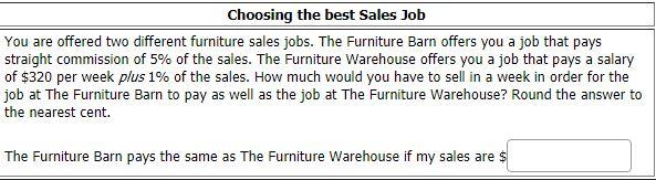 Solved Choosing The Best Sales Job You Are Offered Two Different Furniture Sales Jobs The Furniture Barn Offers You A Job That Pays Straight Commission Of 7 Of The Sales The